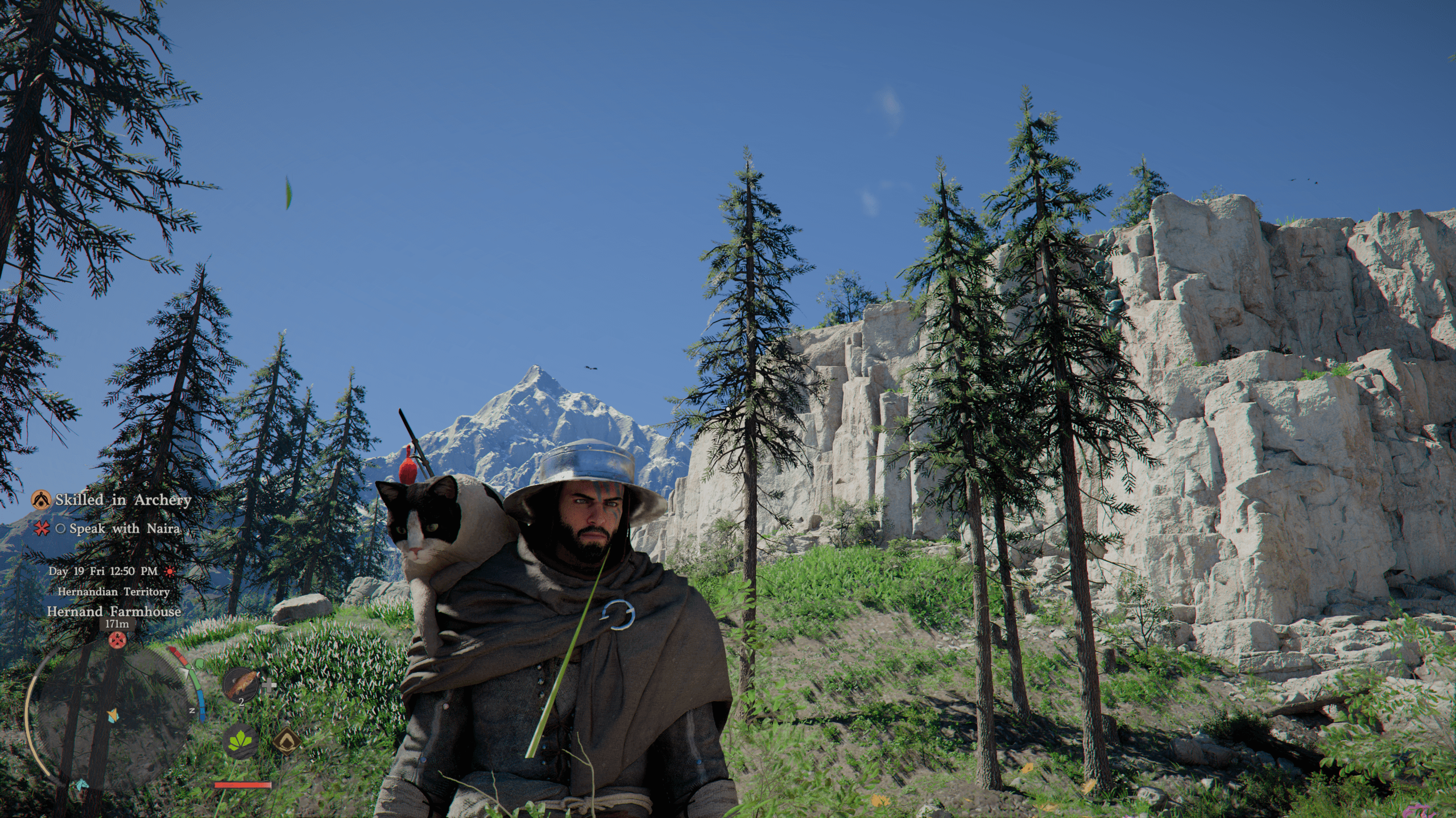 Once you start building out your camp, you’ll be served with a small side mission called “Fang Without a Master”. The goal is to help one of your camp mates, Naira, care for a stray dog she left somewhere. She feels bad about leabing it, and the best solution is obviously to dump the stray on the player. After completing “Fang Without a Master” you basically run around with a pet dog that fetches resources from downed enemies, chopped trees and mined ore. No more manually having to pick up everything. But its a dog, and I’d rather have a cat. So tried taming a cat. And it behaves the same as the dog, picking up resources. And one added bonus, half the time your new cat buddy sits on your shoulder, even when riding a horse.